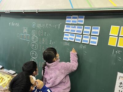 1年生は算数で100より大きい数を学習しました。黒板の前で数えました。
