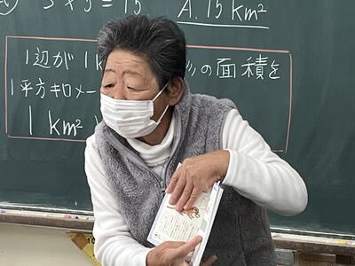 「あた」「ひろ」「つか」。今日の2年生の算数では、体を使った昔の長さの単位を学習しました。「あた」は手をいっぱいに広げたときの親指と中指の幅のことです。「ひろ」は“両手を左右にいっぱいに広げた幅です。「つか」は物をつかんだときのこぶしの幅です。2年生は体を使って机の長さなどを測りました。昔は定規や巻き尺がなかったので、こんなふうにして長さを測定したのですね。