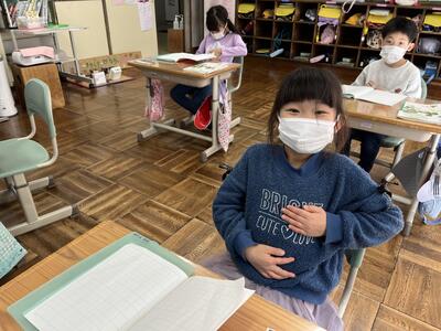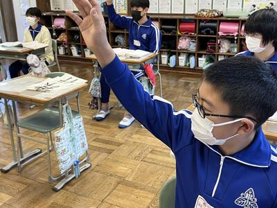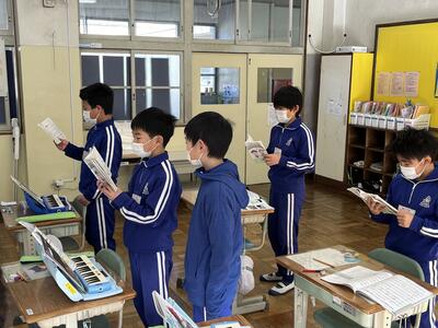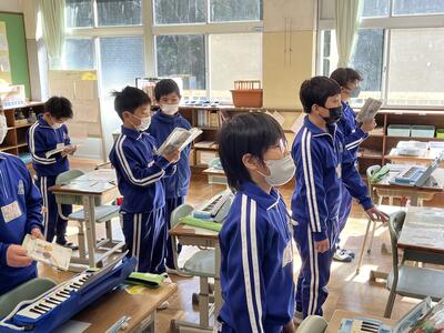 5年生は卒業式で歌う歌の練習を始めました。「believe」という曲です。歌詞とメロディがとても素敵です。たとえば君が 傷ついて くじけそうに なった時は かならず僕が そばにいて ささえてあげるよ その肩を♫ 一生懸命に歌っていました。