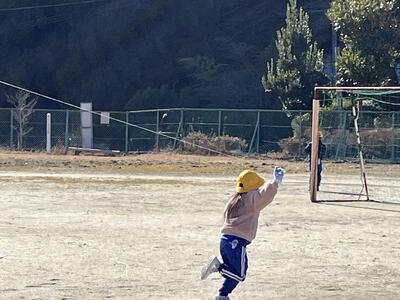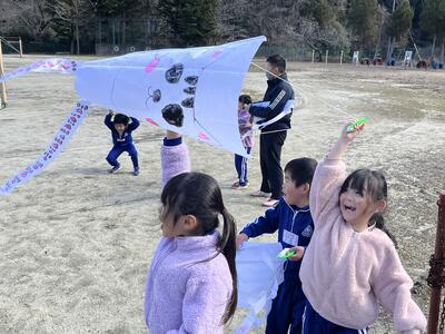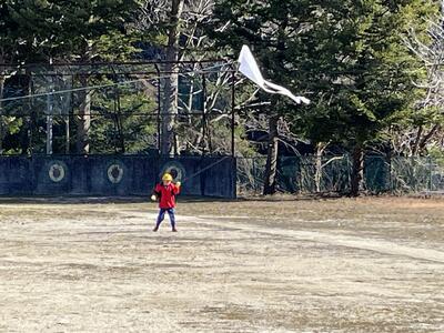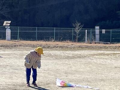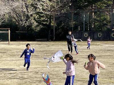 1年生の凧あげの様子です。校庭を走り回り、天高く上げようと頑張っています。