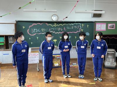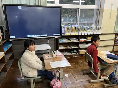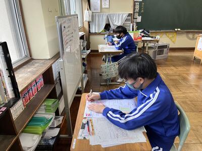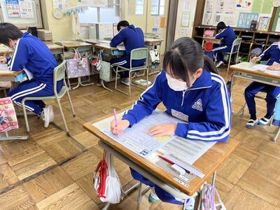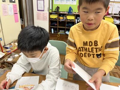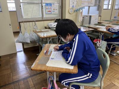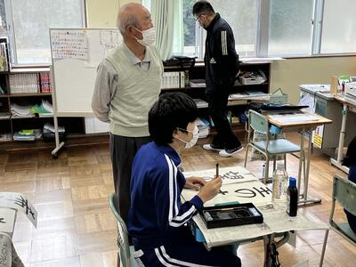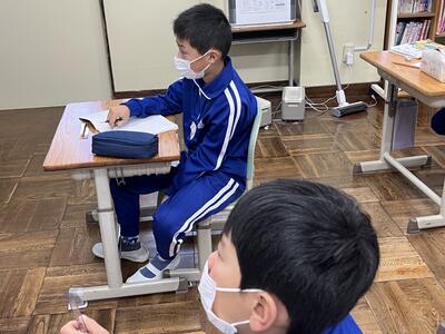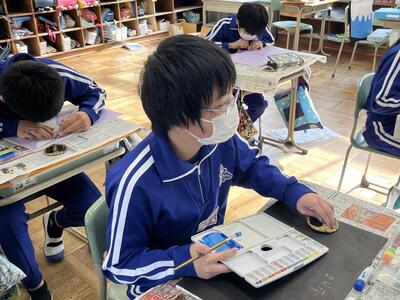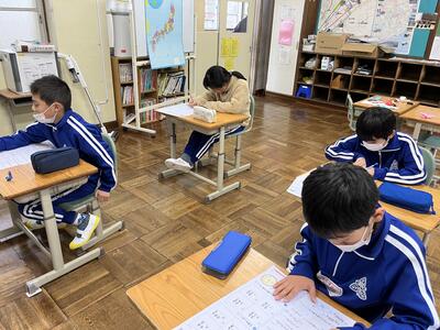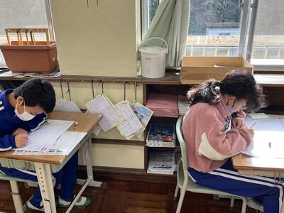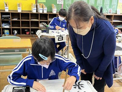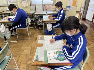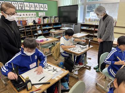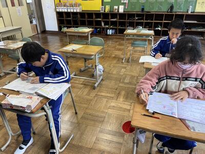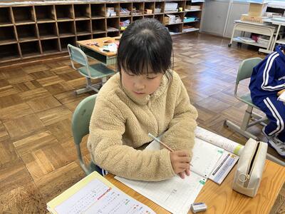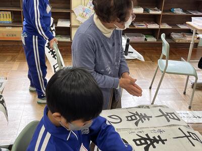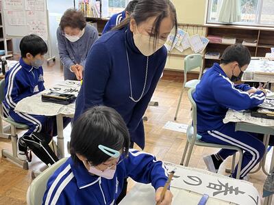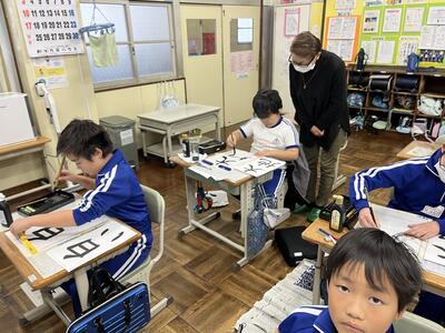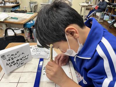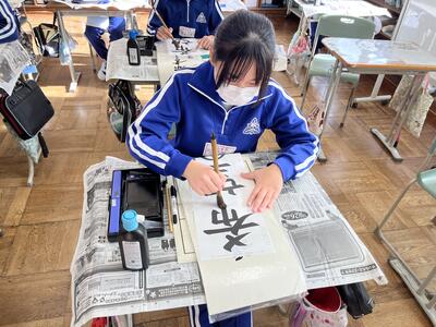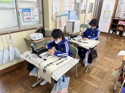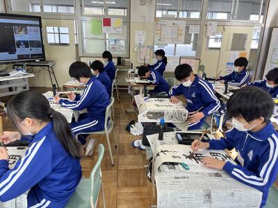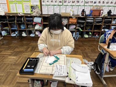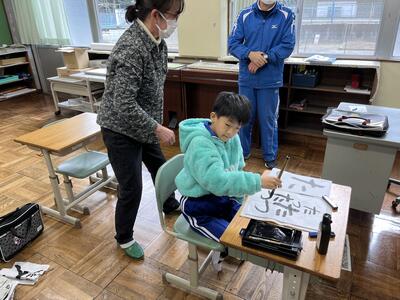 3・4年生は書写で年賀状を書きました。小筆を使って書くので、難しかったのですが、頑張りました。