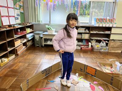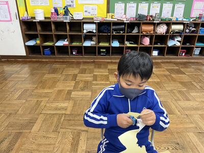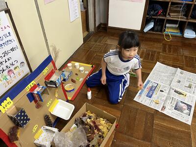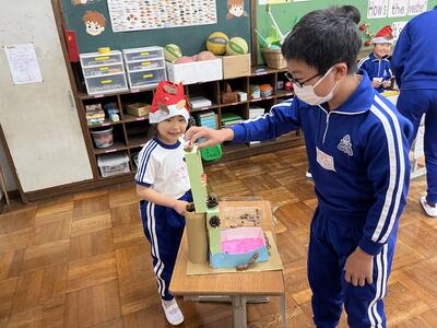 1年生は落ち葉や松ぼっくりをいかして作ったおもちゃ作りを行っています。完成してピースです。