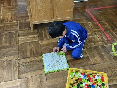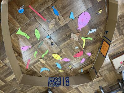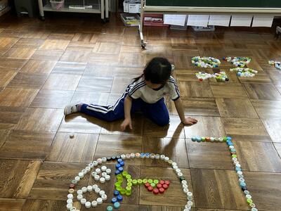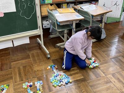 1年生はペットボトルのキャップで大きな芸術作品を作りました。色がたいへんきれいでした。