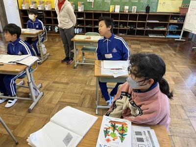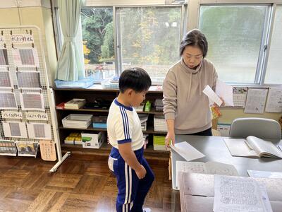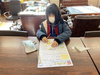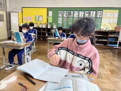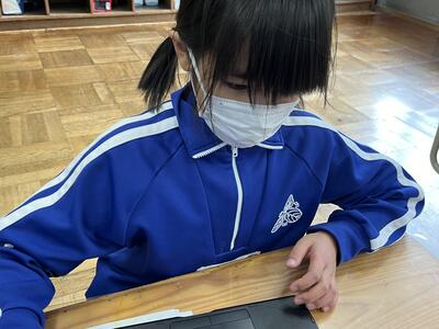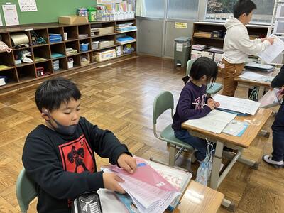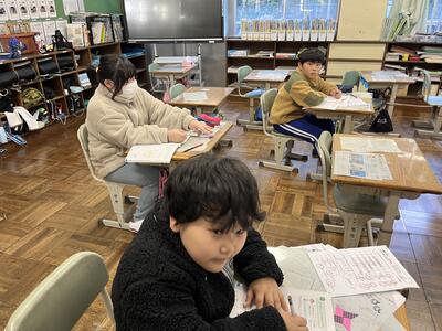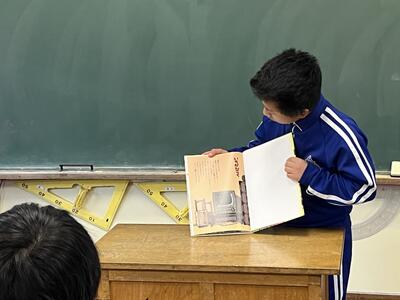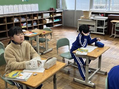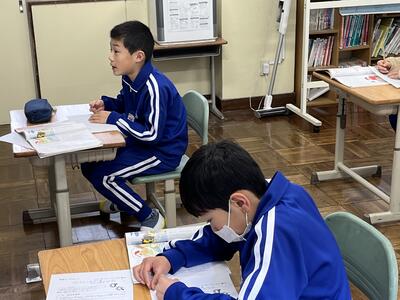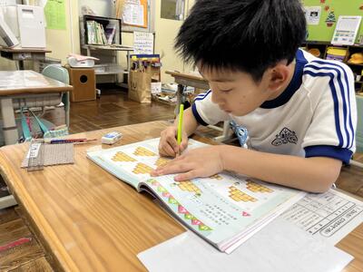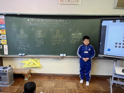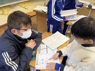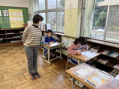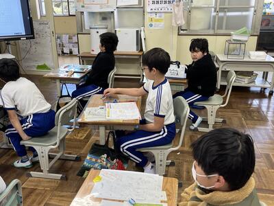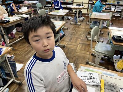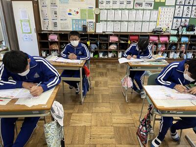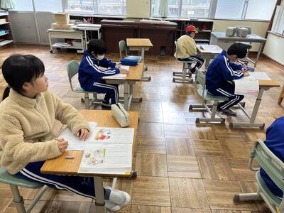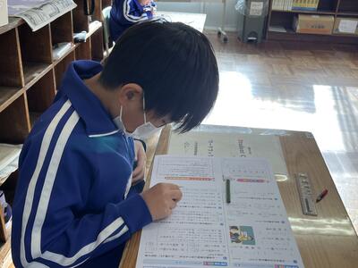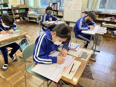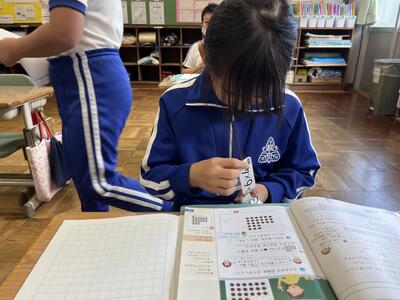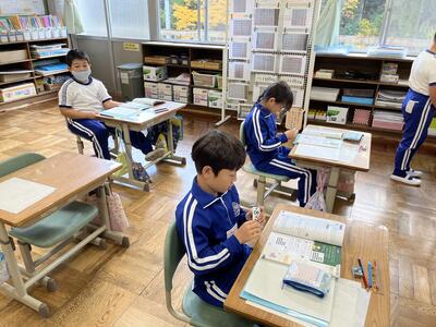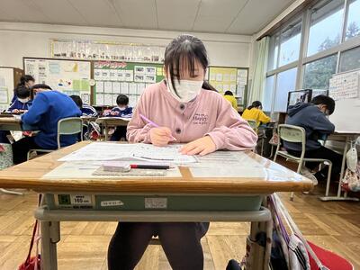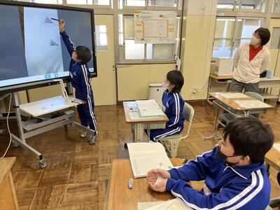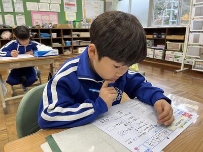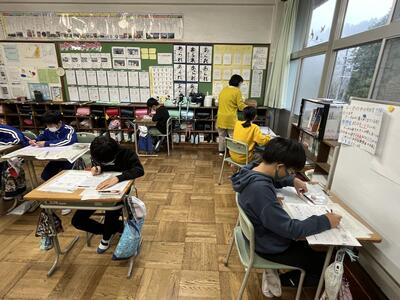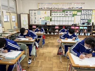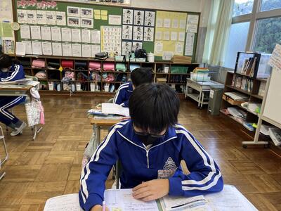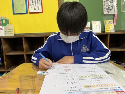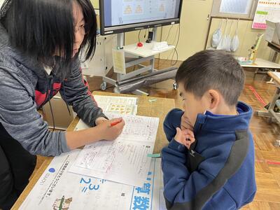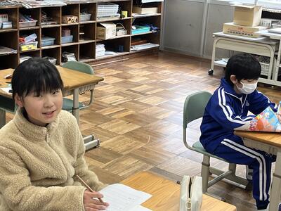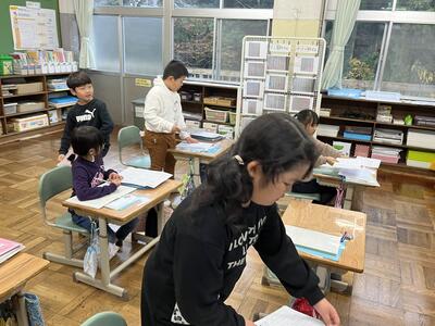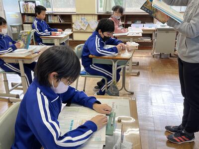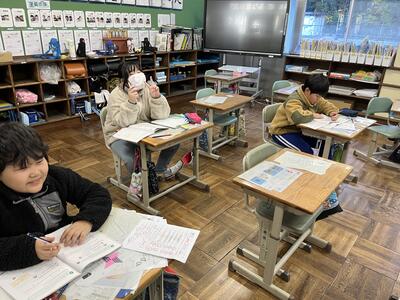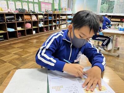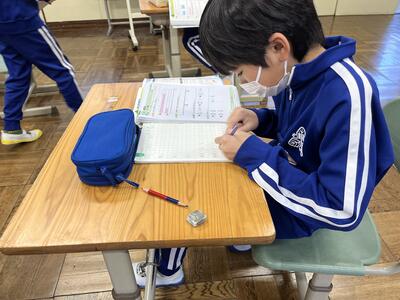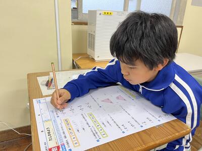 5年生は平行四辺形の面積を求める問題に挑戦しました。先生から丸をもらって「やったー」という声。問題が解けたときはやっぱりうれしいものです。これから台形の面積を求める問題にも挑戦するそうなので、頑張ってくださいね。