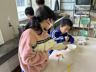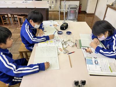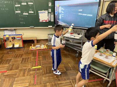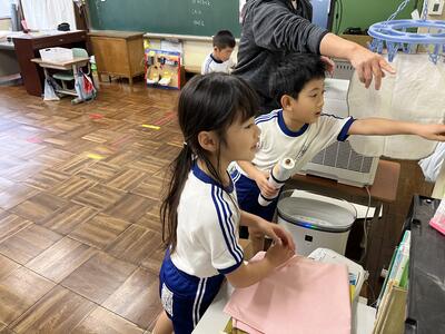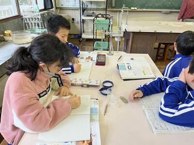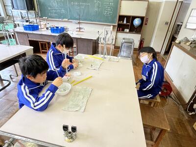 今日は5年生がミョウバンと塩を溶かす実験を行いました。100℃のお湯と冷水では、どのように溶け方が違うのかを調べました。