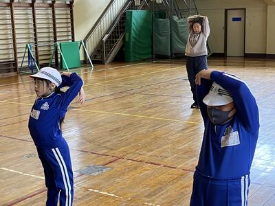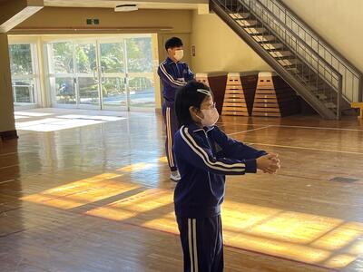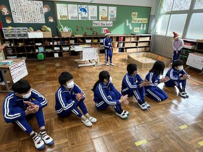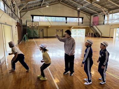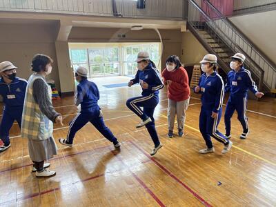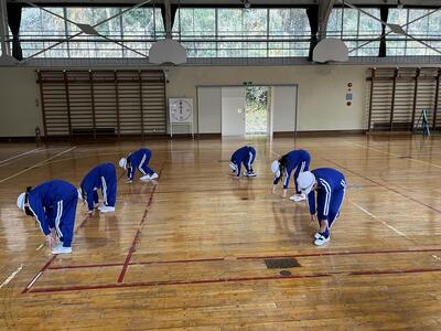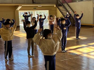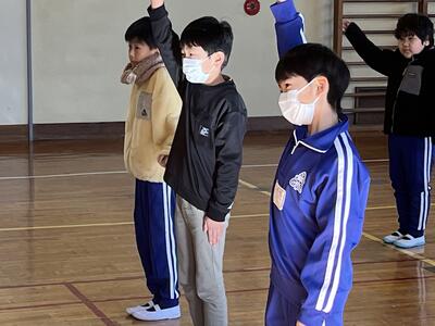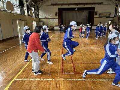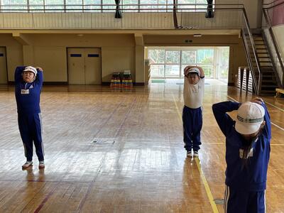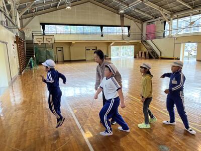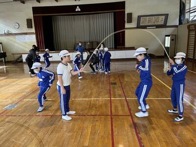 さて今日は1、2年生で一緒に体育の授業を行いました。準備運動の後、一緒に長繩を跳びました。みんな上手でした。