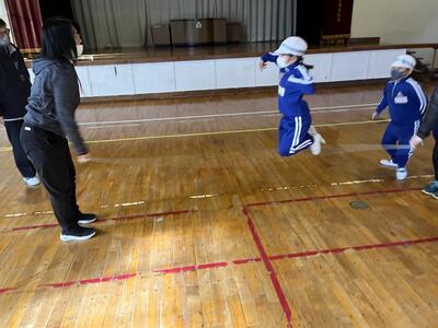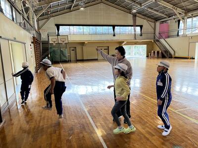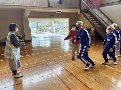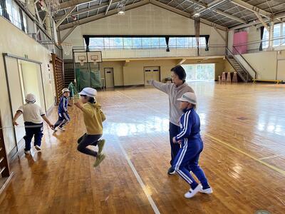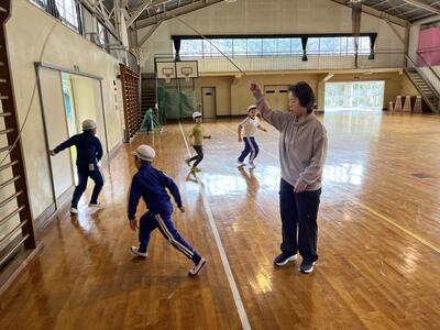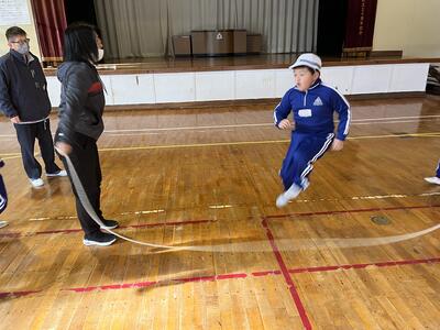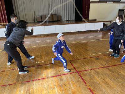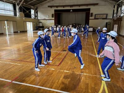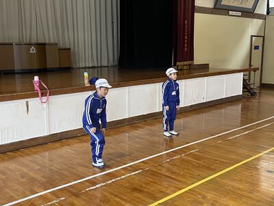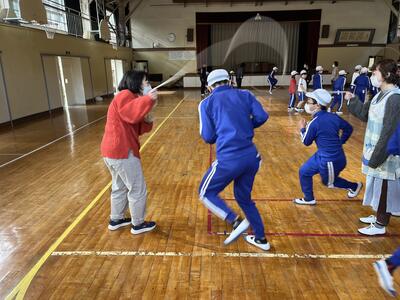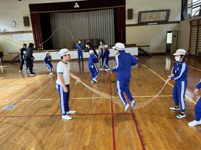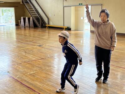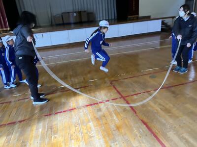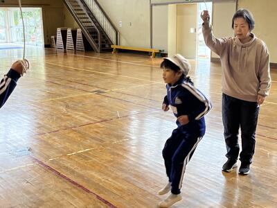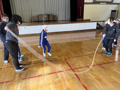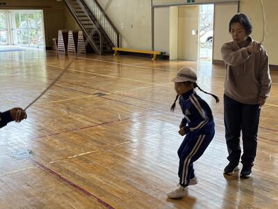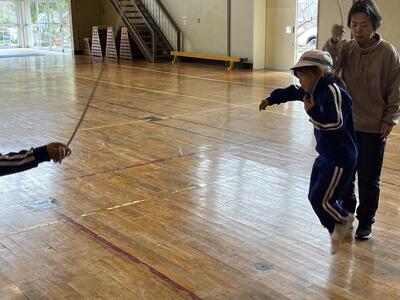 2年生は長なわとびに挑戦。少ない人数でしたが、工夫して楽しむことができました。