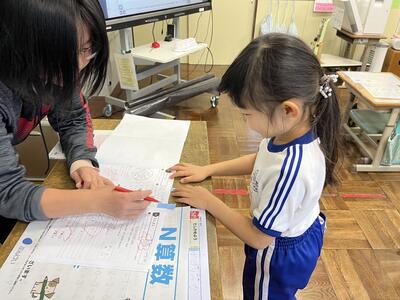 1年生は足し算ピラミッドで計算の技を磨きました。先生に丸もつけてもらいました。
