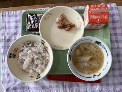 ざっこくご飯、味付けのり、とり肉のバジル焼き、大根と油揚げの味噌汁などでした。6年生の教室に行くと自分たちが考えた献立をもりもり食べていました。