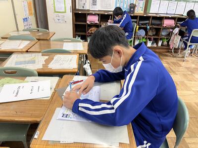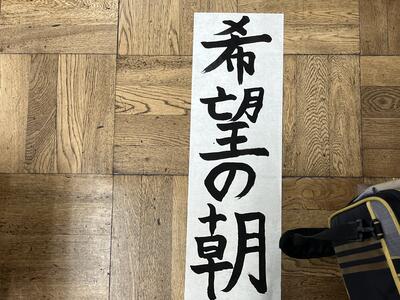 5・6年生はかきぞめの練習をしました。長い紙に書くので、少し緊張しました。