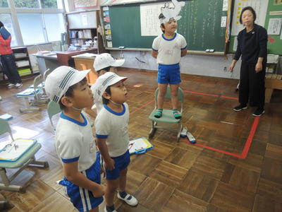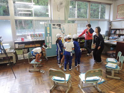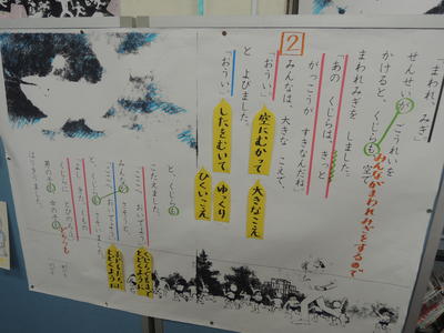 第1学年国語科『くじらぐも』授業研究会の様子です。1年生が場面の様子が伝わるように、動作や声の大きさ、速さなどを工夫しながら、元気よく音読していました。