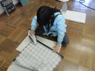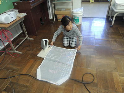ミシンを使って縫う人、アイロンを使ってしわを伸ばす人、まつり縫いをする人、みんな、すてきなオリジナルエプロンを作っていました。