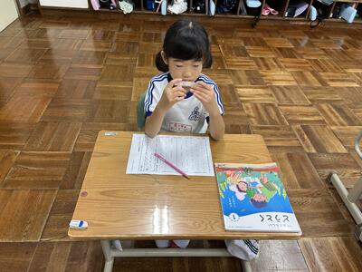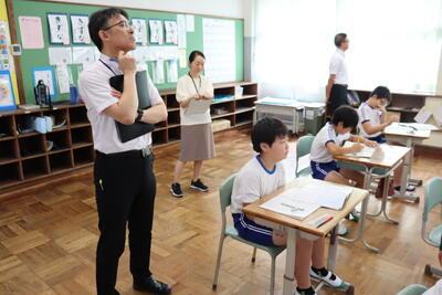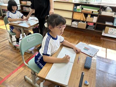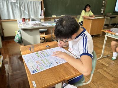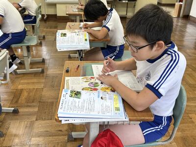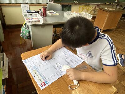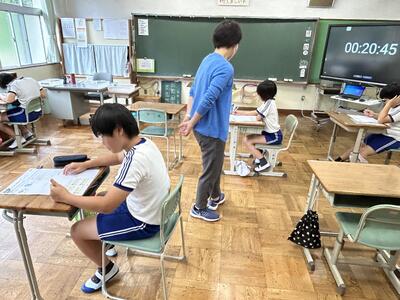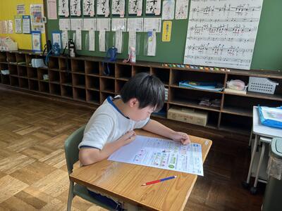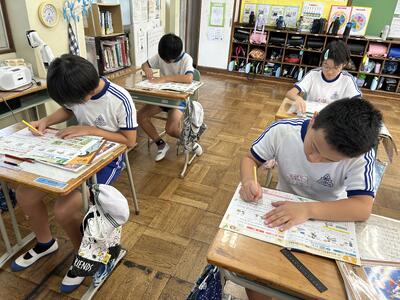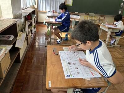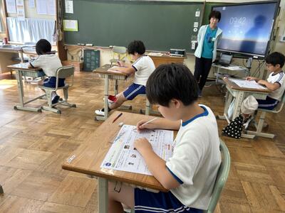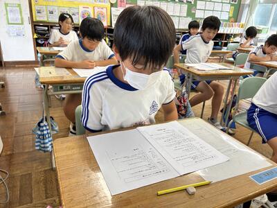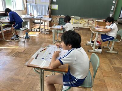 5年生は理科の単元テストです。真剣に問題に取り組み、回答していました。