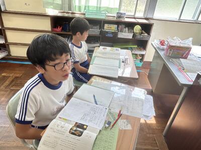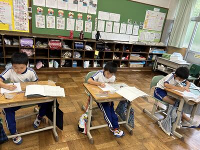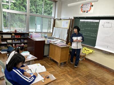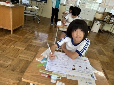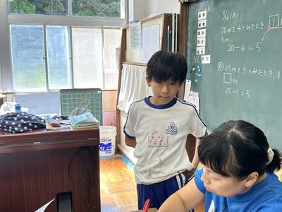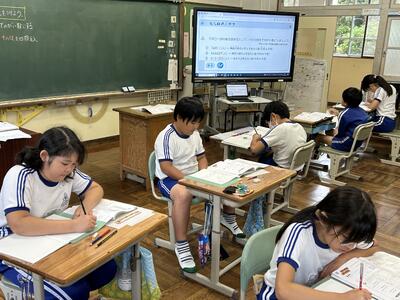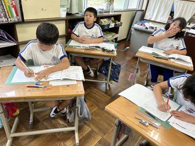 3・4年生は複式ですが、協力して仲良く学習しています。今日は算数の学習を頑張りました。
