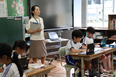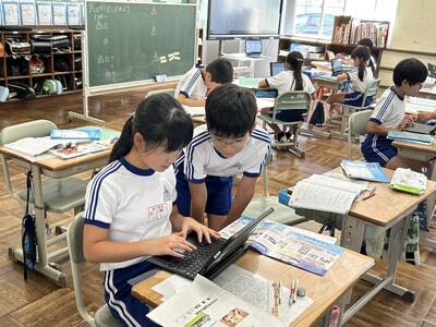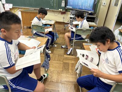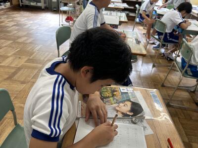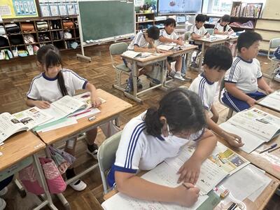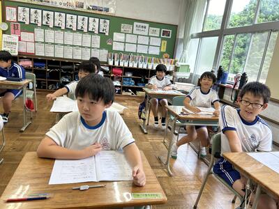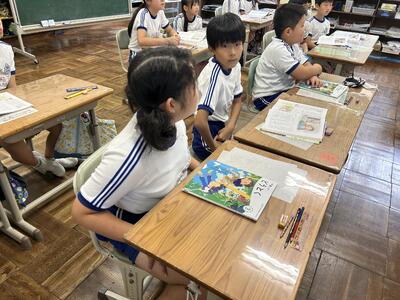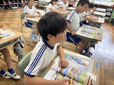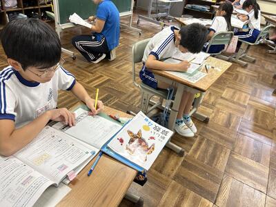 3年生は「ちいちゃんのかげおくり」を学習しています。今日は初めの場面の「空」の変化について着目して、学習を行いました。途中の話し合いでは、活発に意見が出されました。