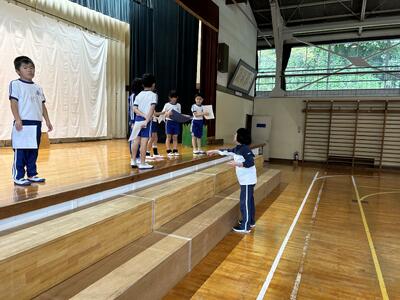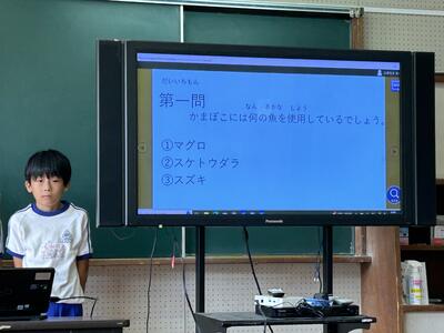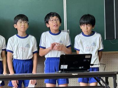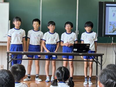 今日の児童集会は4年生が担当しました。先日、見学学習を訪れた夕月かまぼこといわき震災伝承みらい館についてまとめた発表でした。パワーポイントを使い、発表の途中にはクイズもあり、わかりやすい内容の発表でした。4年生の皆さん、すてきな発表をありがとう。その後、今月の詩の音読をして、「野に咲く花のように」を全校合唱して児童集会は終了しました。