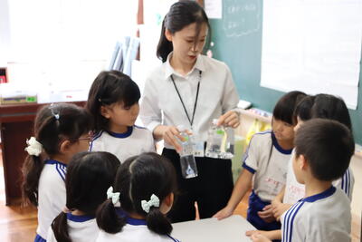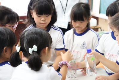 1年生は算数で水のかさの量を調べました。どのペットボトルの水が多いのかを考える授業でした。