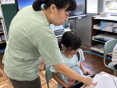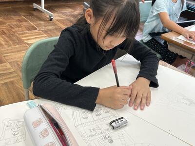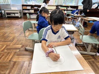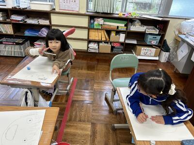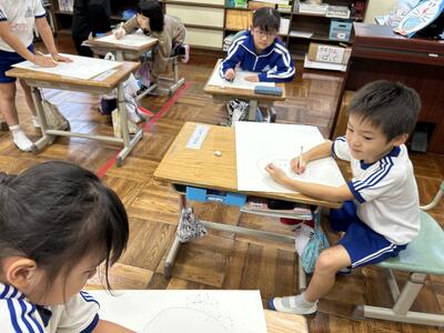 1年生の図工の様子です。今日は鉛筆で下書きをしました。できばえは上々です。