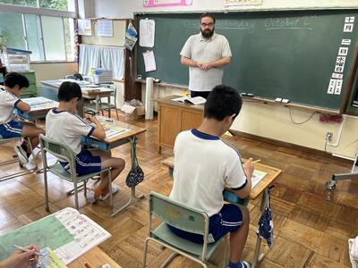 今日はALTのジョン先生が来校される日。子どもたちはみんな英語の授業を楽しみにしています。今日もジョン先生と友によく学び、よく遊びました。ますます英語が好きになりましたね。