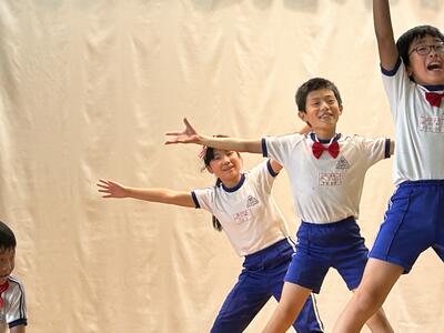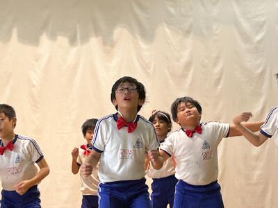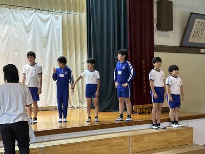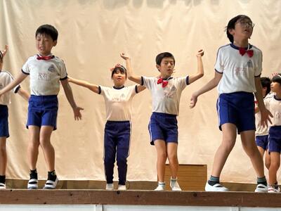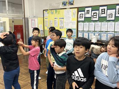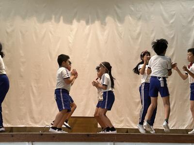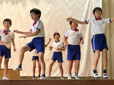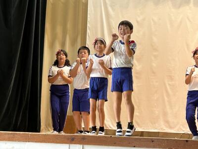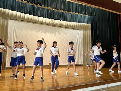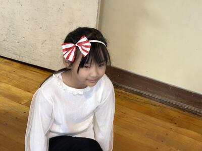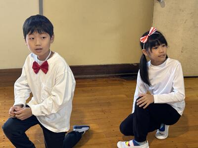 3・4年生のダンスが完成間近です。今日は男子が蝶ネクタイ、女子が頭にリボンをつけて、本番と同じように練習しました。なお、このダンスは学習発表会でも披露するそうです。