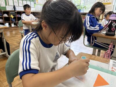2年生は四角形を切ると三角形ができるという学習をしました。今日は折り紙を使って、学習したことが正しいかを確認しました。