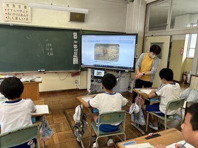6年生は理科で地層の学習をしました。テレビの画面を見ながら、地層の名前を覚えました。