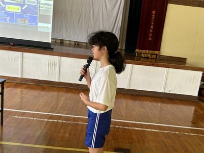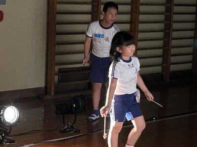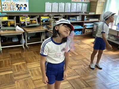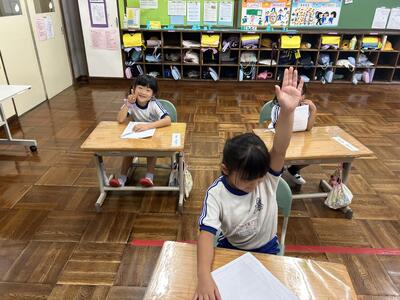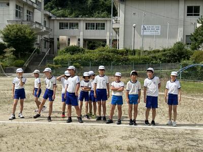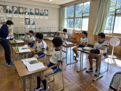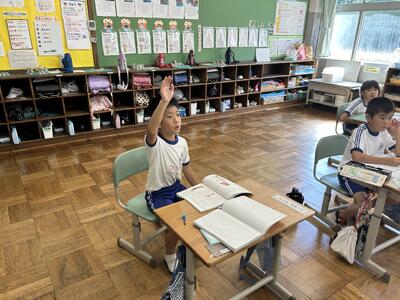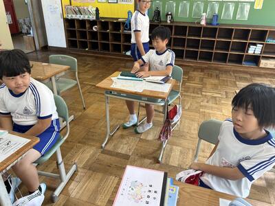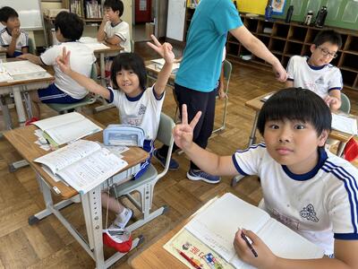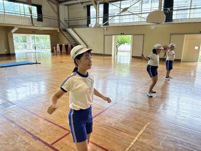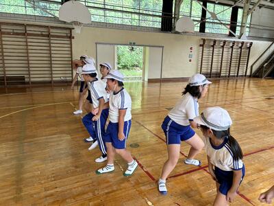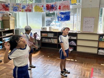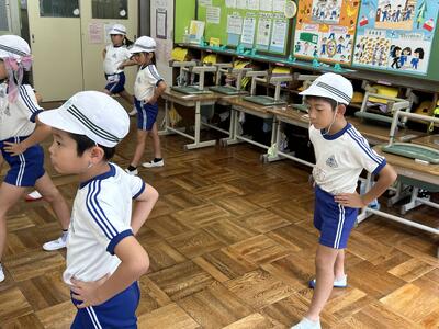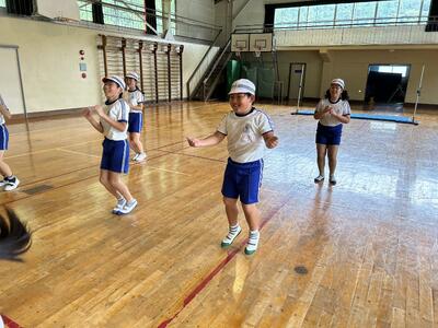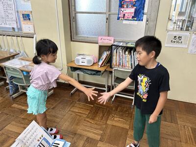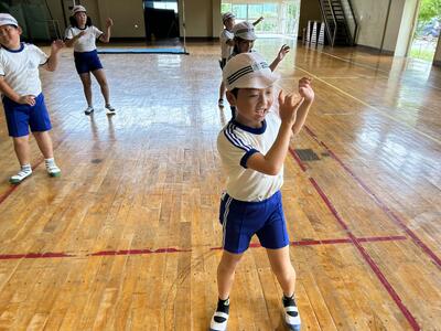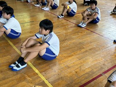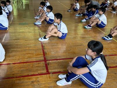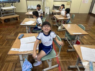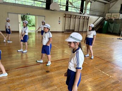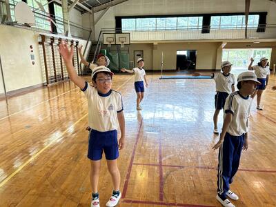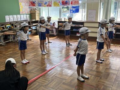 日差しが強く、気温が高かったので、2年生の体育は教室で体操を行いました。「1・2・3・4」と元気なかけ声で行うことができました。