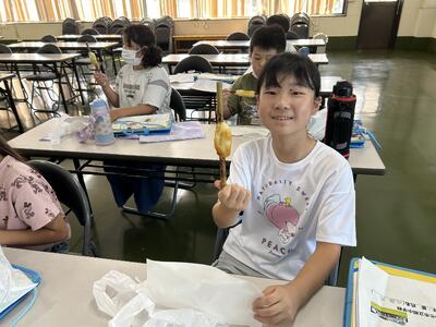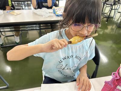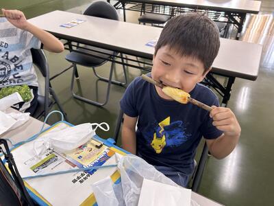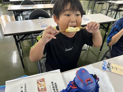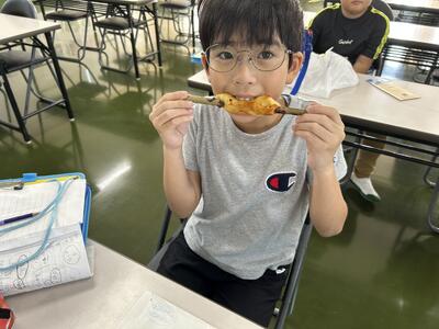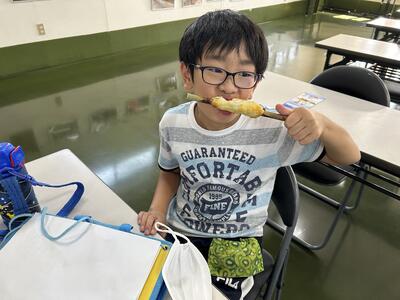 さぁ、自分で棒につけたかまぼこが焼き上がりました。実食の時間がやってきました。子どもたちはみんな笑顔です。