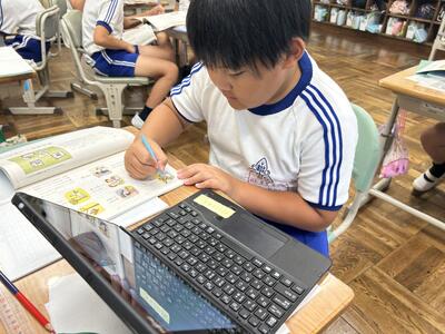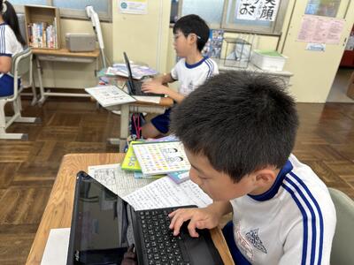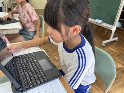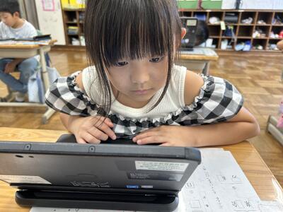 今日の5時間目、タブレットでドリル問題に集中する姿を見つけました。タブレットだとたくさんの問題を解くことができるから、便利ですね。