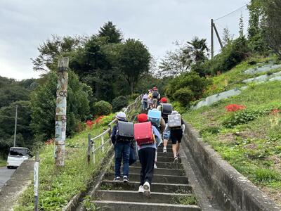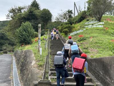 今日も学校前の長い階段を上っての登校です。綴の子どもたちは足腰を毎朝、鍛えています。