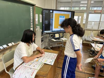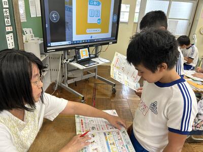 6年生は英語の学習を頑張りました。発音を先生に確認してもらいました。その後、ライティングも行いました。