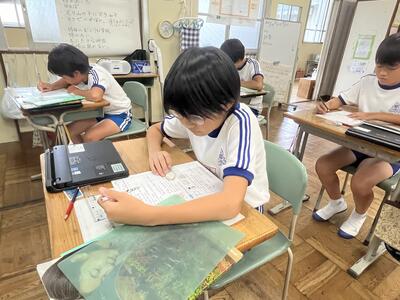 6年生は説明的文章を学習しました。大事なところに線を引くという先生のアドバイスを受けて、教科書に線を引く姿が見られました。