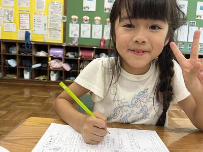 校舎内で今日も真剣な顔。すてきな笑顔。ピースサインなど子どもらしい様々な表情を見ることができました。