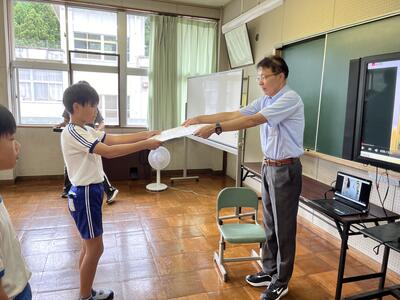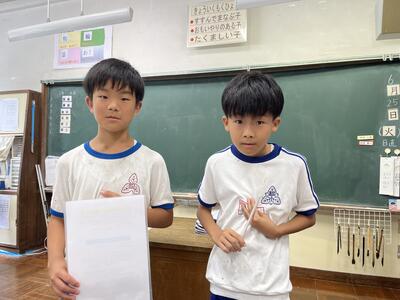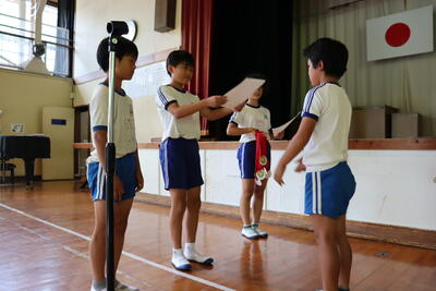 大休憩には市陸上大会の表彰を行いました。綴小は男子100mとリレーで入賞し、賞状をいただきました。8名で参加で2枚の賞状とはすばらしいと思います。また自己ベストを出した児童、最後までやり切った児童がたくさんいました。今日はがんばった6年生の労を全校生でねぎらいました。