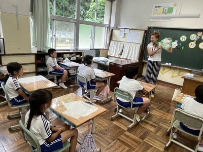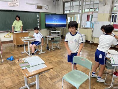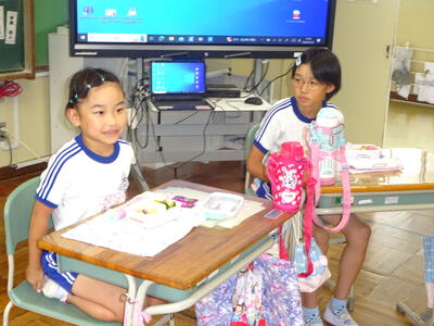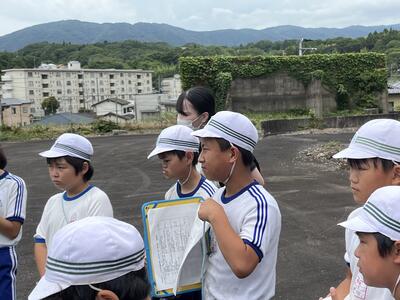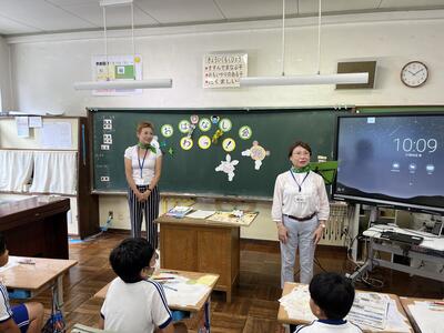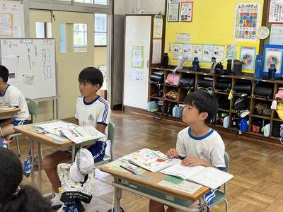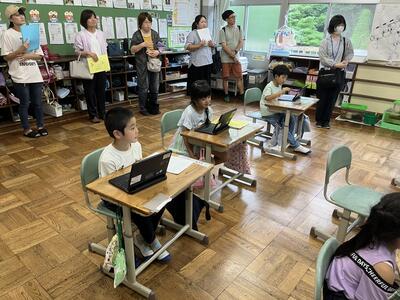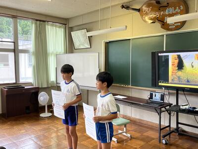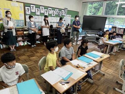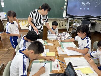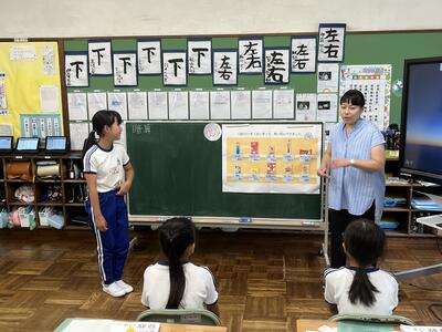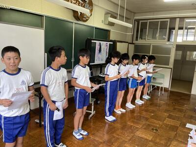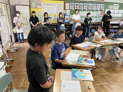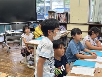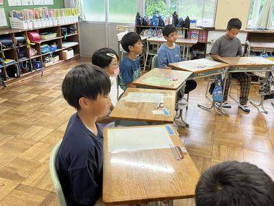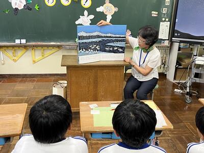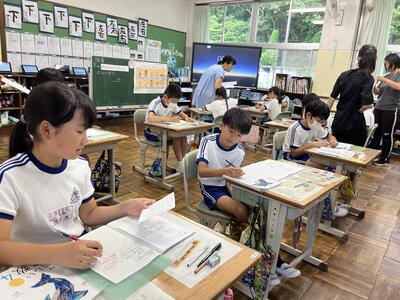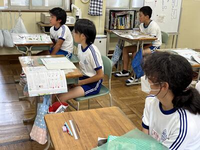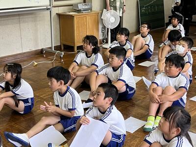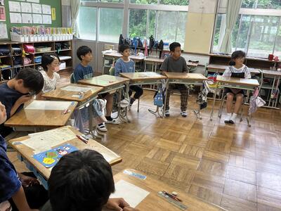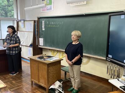 3・4年生はいわき回転櫓盆踊り実行委員会総務委員会委員長の三室千鶴子さんを講師にお招きし、児童に回転櫓の歴史や盆踊りに込められた思いをお話しいただきました。三室さんのお話はテンポのよく、時間があっという間に過ぎていきました。子どもたちはたくさん質問し、しっかりメモを取ることができました。