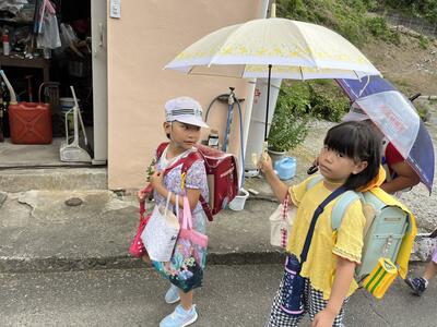 登校時に少しだけ雨が降りました。その際、かさを持っていなかった2年生に1年生が自分の持っていたかさに「一緒にに入ろう」と声をかけました。2人仲良く、相合い傘での登校です。