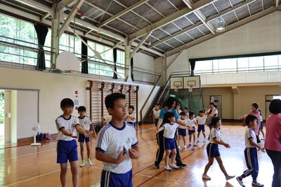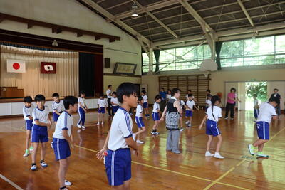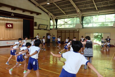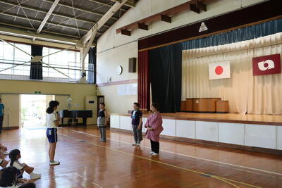 今日は回転櫓盆踊りの講習会が行われました。講師に山﨑様と他に2名の先生方に教えていただきました。踊りの手の動きはいわきの海を表すことなどを教えていただき、足のステップを確認してから踊りました。体育館は厚く、たくさん汗をかきましたが、終始笑顔が絶えませんでした。8月の回転櫓盆踊り当日は、綴小のぱっぴを着て踊ります。
