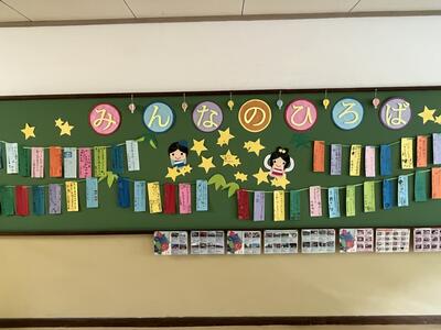 学校の掲示板に七夕の飾りが…。1日遅れですが、短冊に書いた願い事をいくつか紹介します。