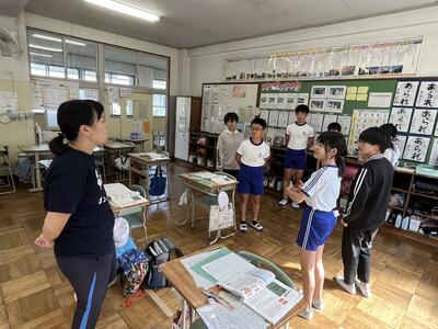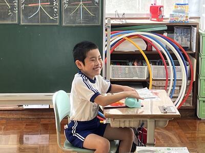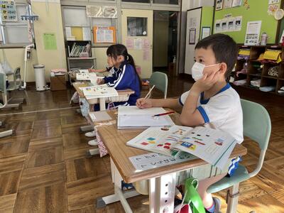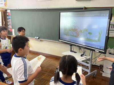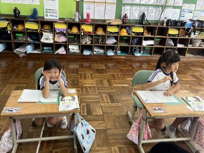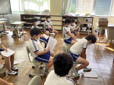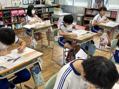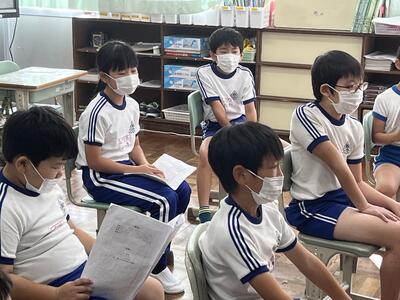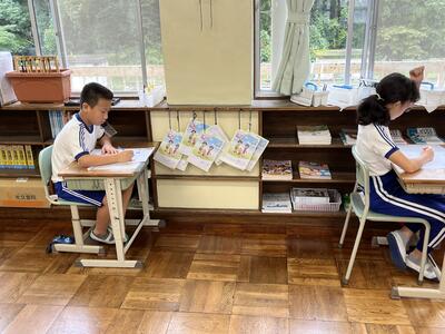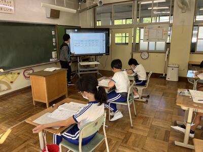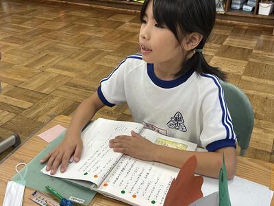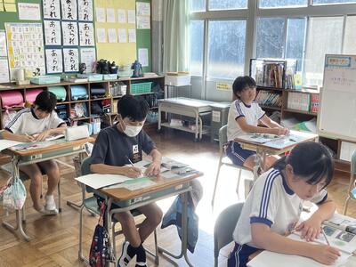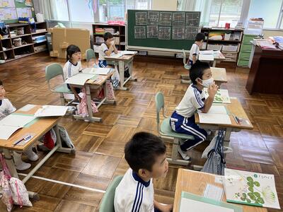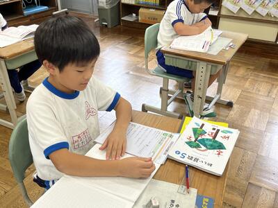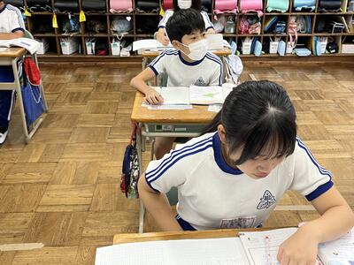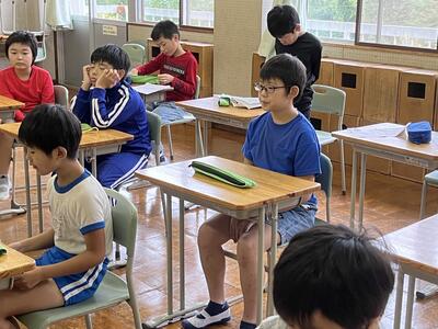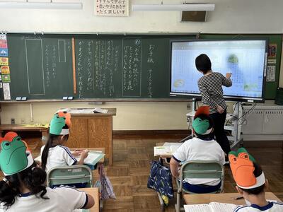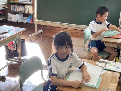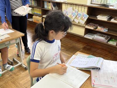 大休憩には1年生から6年生まで校庭で思い思いに虫取り、ブランコ、ドッジボールをする姿が見られました。涼しい日も子どもたちは元気です。5年生は分数を小数に直す問題に挑みました。中学校でも理科など学習の中でよく使う事柄なので、しっかりと覚えてほしいと思います。2年生のがまくんとかえるくんはとてもかわいかったです。