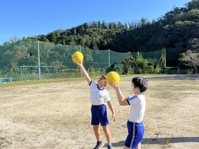 西の空に月が見えたため、今日は急遽、月の満ち欠けの学習を行いました。ボールを月に見立て、手を伸ばしてみると…。「空にある月の形と同じ形だ」と歓声が上がりました。その後、子どもたちは影遊びをして友情を深めました。