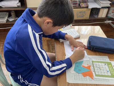 雨が降ったりやんだりの涼しい日です。各学年とも学習発表会の練習を体育館で行いました。3年生の算数ではコンパスの使い方を学習しました。授業の終わりには上手に円が描けるようになりました。一つずつできることを増やす綴小学校の子どもたちです。