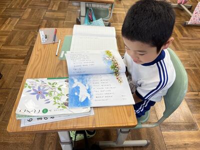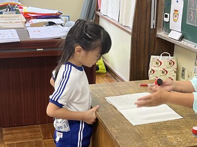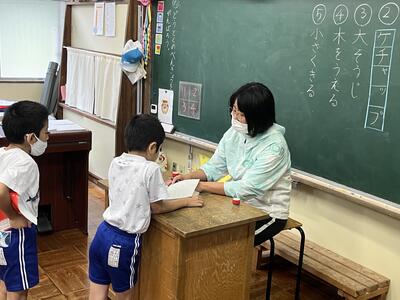 1年生は文字をきれいに書いて先生に確認してもらいました。