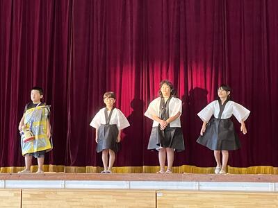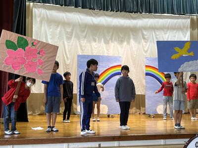 2年生の劇「おしょうと小僧」です。おしょうさんと小僧さんのやり取りがおもしろく、また泥棒のコミカルな演技もすばらしかったです。最後は2年生全員で「にじ」を歌いました。