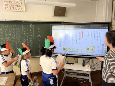 今日はすばらしい秋空です。秋空の光に負けないくらい元気に学習しています。2年生の国語では「おてがみ」を学習しました。本文には書かれていないがまくんとかえるくんの気持ちを考えてました。5年生は算数で分数の応用に挑みました。