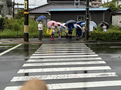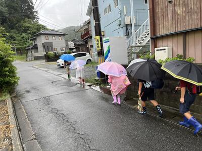 今日は久々に朝から雨降りの1日です。傘を差しての登校になりました。整然と安全に通学路を歩きました。