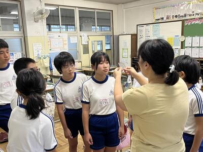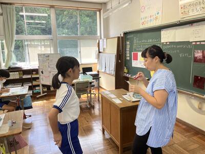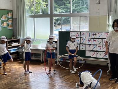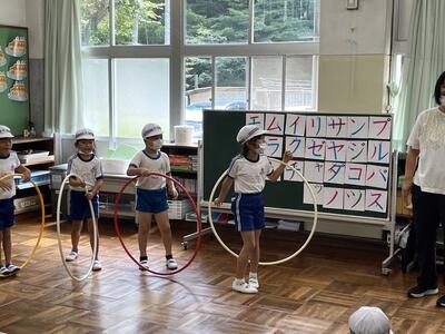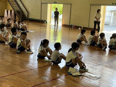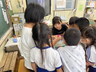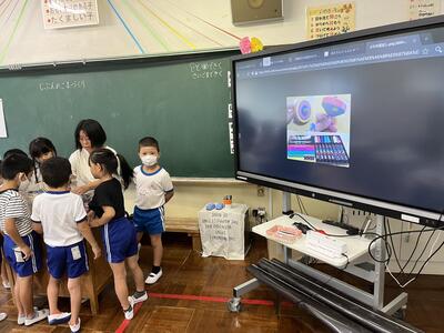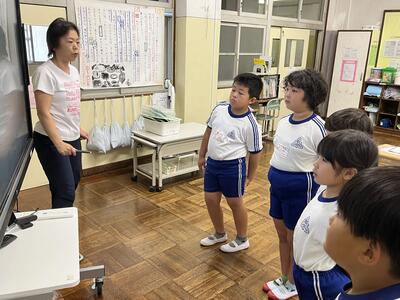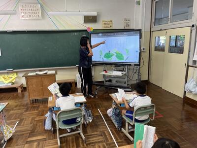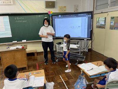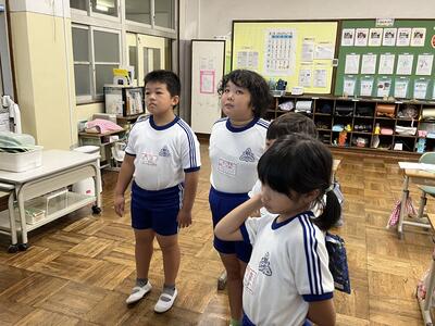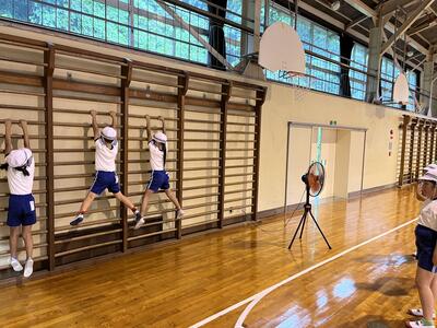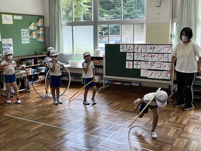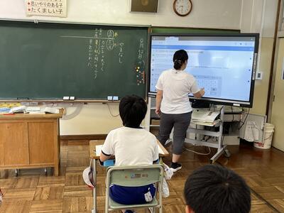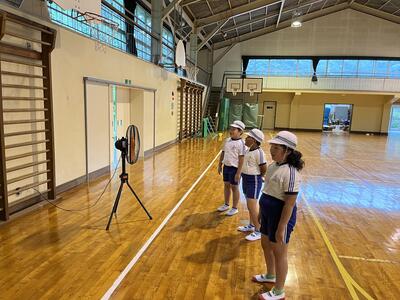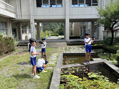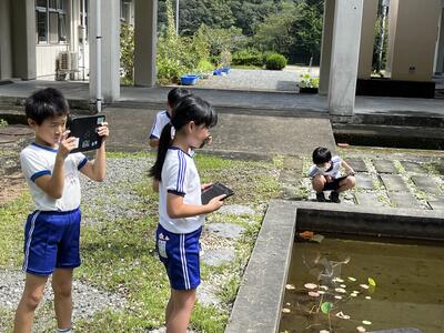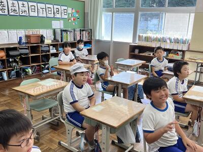 授業は今日もがんばりました。1年生は体育でフラフープ、3年生は理科でタブレット端末を使って、トンボの撮影を行いました。他の学年も暑さに負けず、しっかり学習しました。