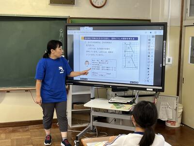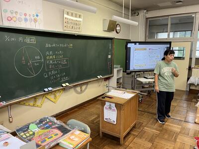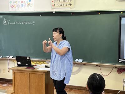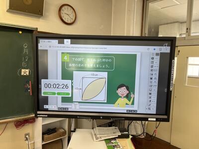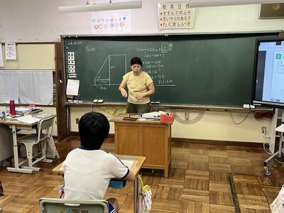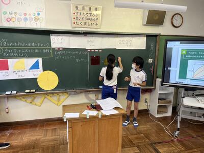 今日は6年生で授業研究会を行いました。ラグビーボールの形の面積の求め方を説明するという授業でした。6年生は知恵を絞り、仲間と協力しながら問題の解き方を説明しました。