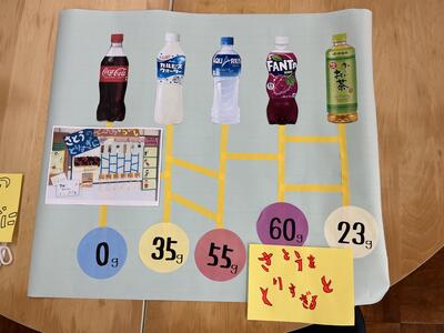 昨日の保健委員会の活動で、飲み物の中に含まれる砂糖の量を調べ、掲示物を作成しました。砂糖の取り過ぎに注意です。