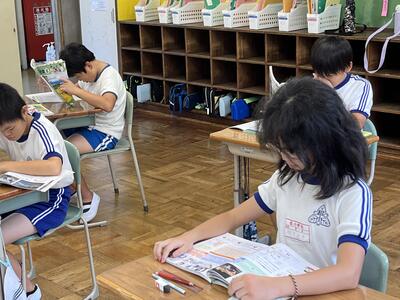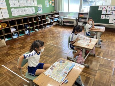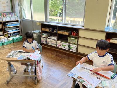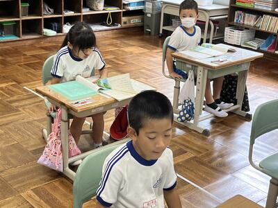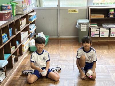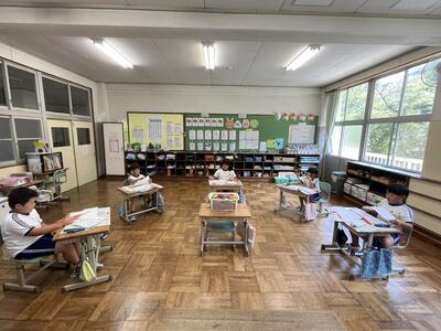 朝登校してすぐの様子を見に行くと各学年で仲良く生活していました。2年生は授業で作ったとことこ車で遊び、6年生は読書と今日の予習をする姿が見られました。他の学年もわきあいあいと朝の時間を過ごしました。