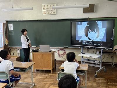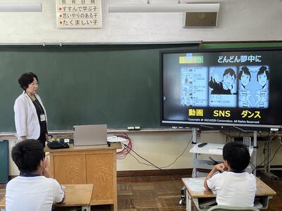 5年生は、金融広報アドバイザーの柳沼様より情報モラルについての授業を受けました。正しいICT機器の活用法やネット依存について詳しく教えていただきました。オンラインゲームやSNSを行う際は時間を決めて行うことが大事である。
